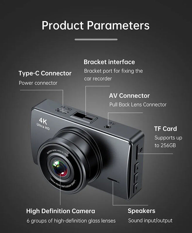 Dual Lens 4K Car Dash Camera with Wi-Fi and Night Vision – Black